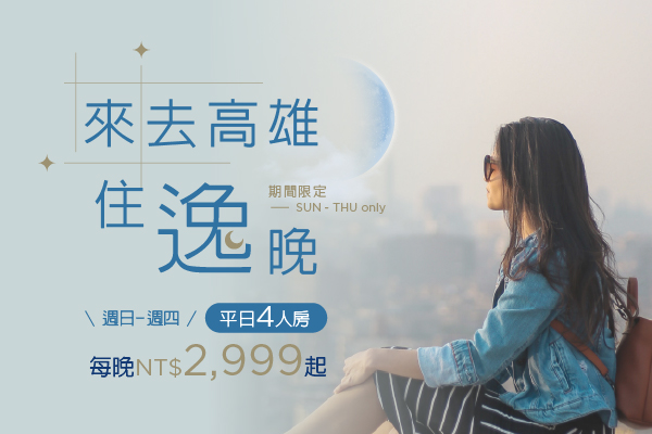 平日(週日~週四)預訂「來去高雄住逸晚」住房專案,入住每晚2,999元起,可至 THE Lounge 不限次數免費享季節迎賓飲品、水果、福義軒餅乾等,更多專屬禮遇等您來體驗!