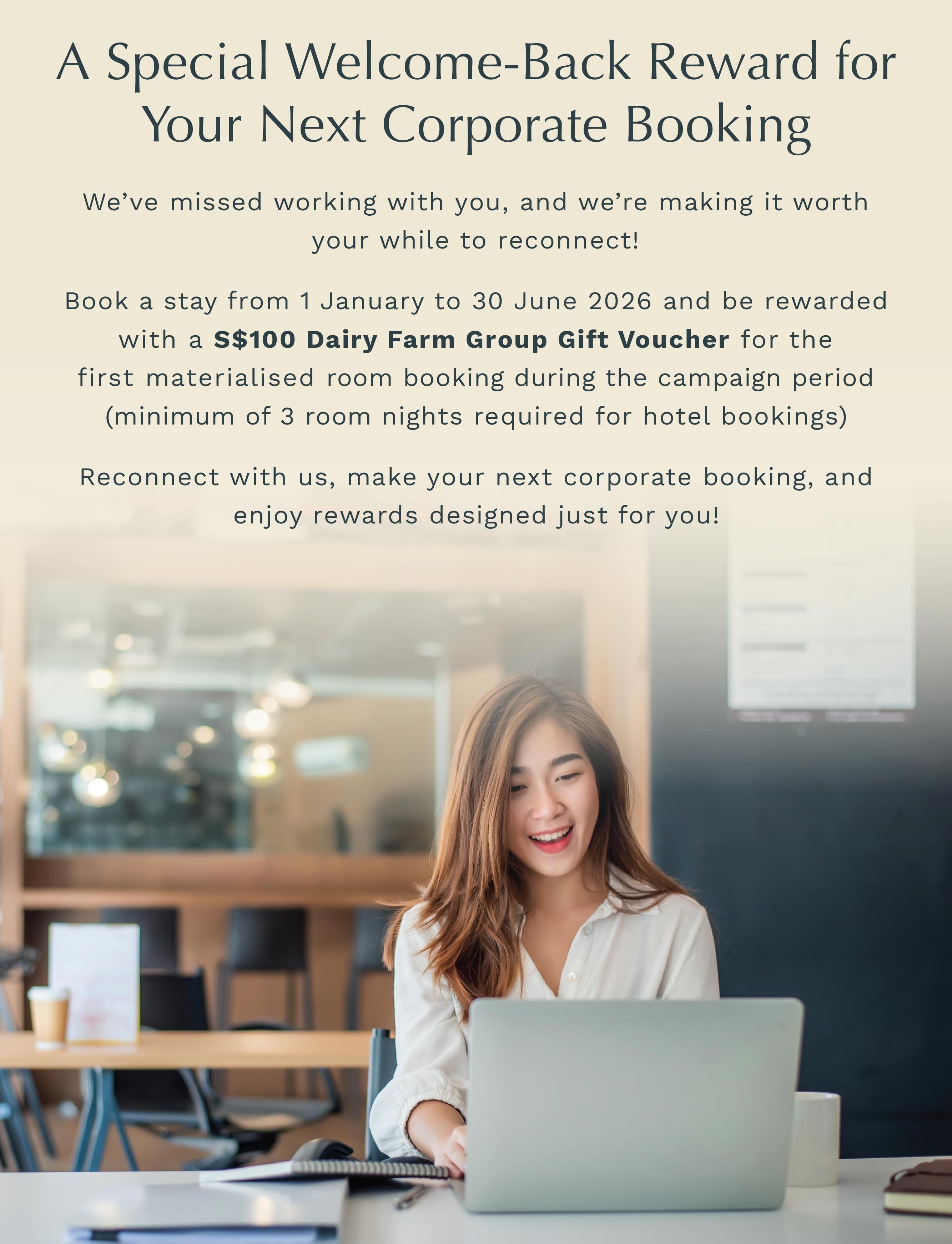 - Participating Properties: Applicable to all participating properties (hotels and serviced residences) under the FAR MORE Rewards program (refer to list here) - Member is required to register only once during the campaign period and closing date for registration is 30 June 2026. Any late entries submitted after 30 June 2026 will not be entertained. - A S$100 Dairy Farm Group Gift Card will be awarded for the first materialized booking during the campaign period. A minimum of 3 room nights is required for hotel bookings.