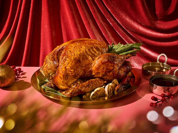 A succulent whole turkey roasted with fragrant herbs, served with rich turkey gravy and a tangy aged balsamic cranberry sauce.