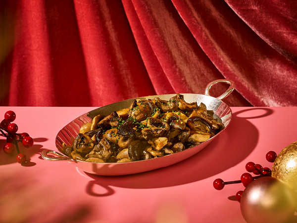 Roasted mushrooms infused with aromatic garlic and thyme, offering an earthy depth to your festive meal.